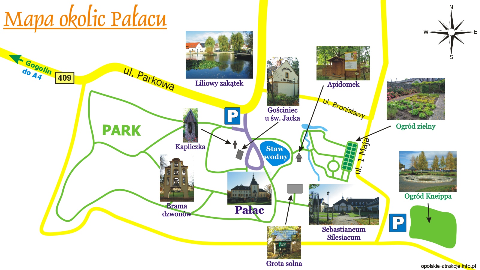 Obrazkowa mapa okolic samego pałacu i parku. Jak dotrzeć do bramy dzwonów, ogrodu Kneippa,